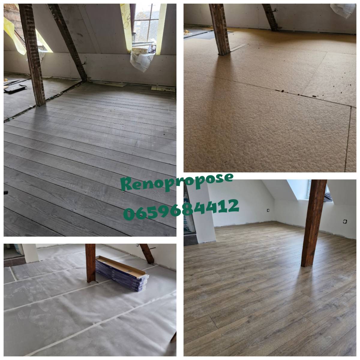 pose de dalles en fibre de peuplier pour rattraper les défaut du support et donner une meilleur isolation phonique puis une pose de panneaux osb suivi d'une pose de stratifier de chez quick step avec les plinthes qui vont bien