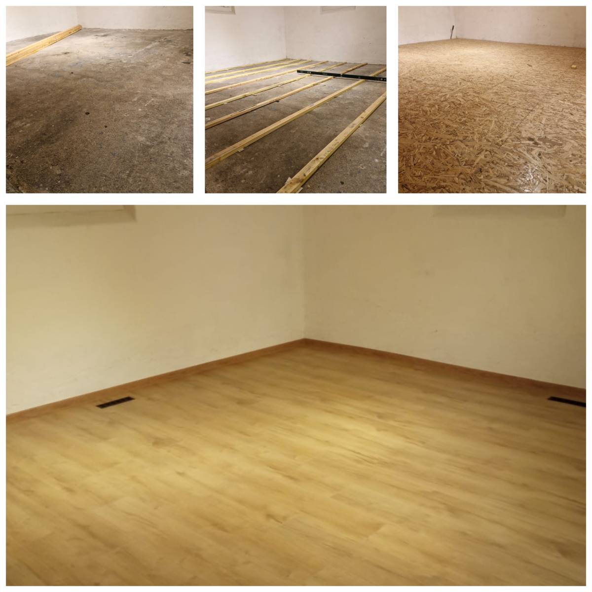 Pose de lambourdes, recouvertes de panneaux OSB, puis installation d’un stratifié Advanced Superior AC4 8 mm à 4 chanfreins, avec plinthes MDF assorties et ajout de grilles d’aération dans un sous-sol situé à la Robertsau, Strasbourg.