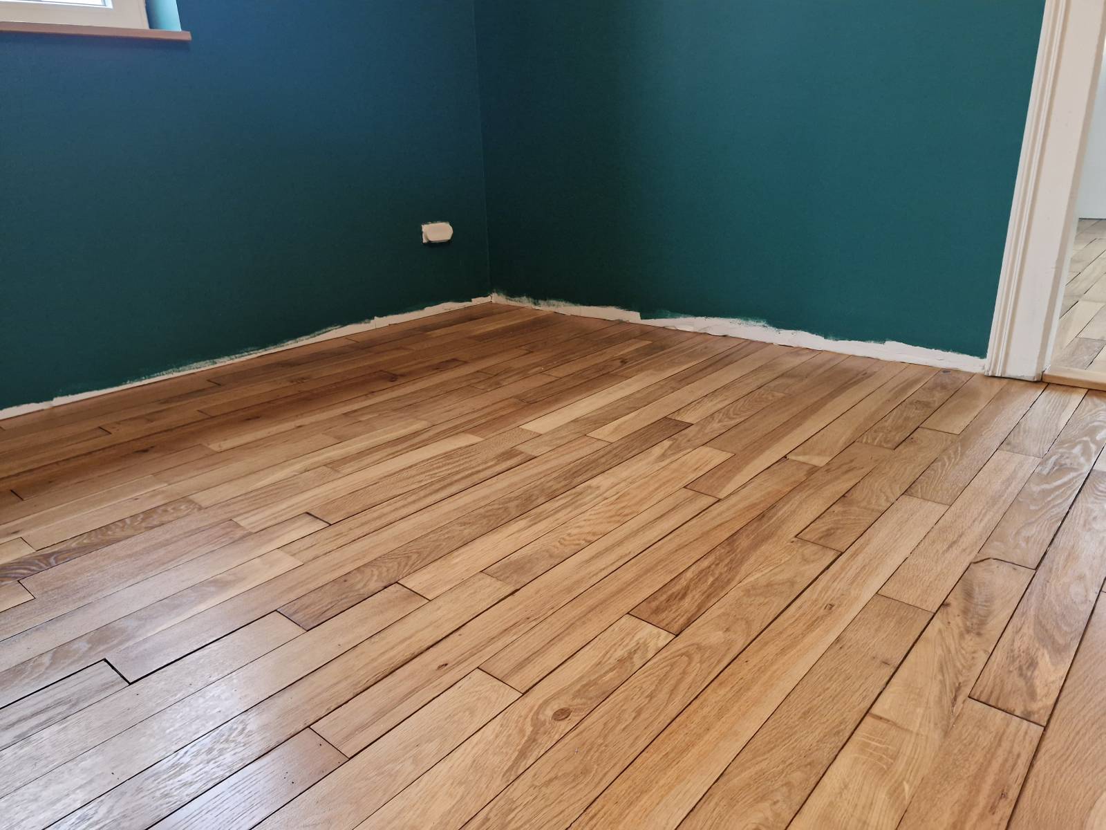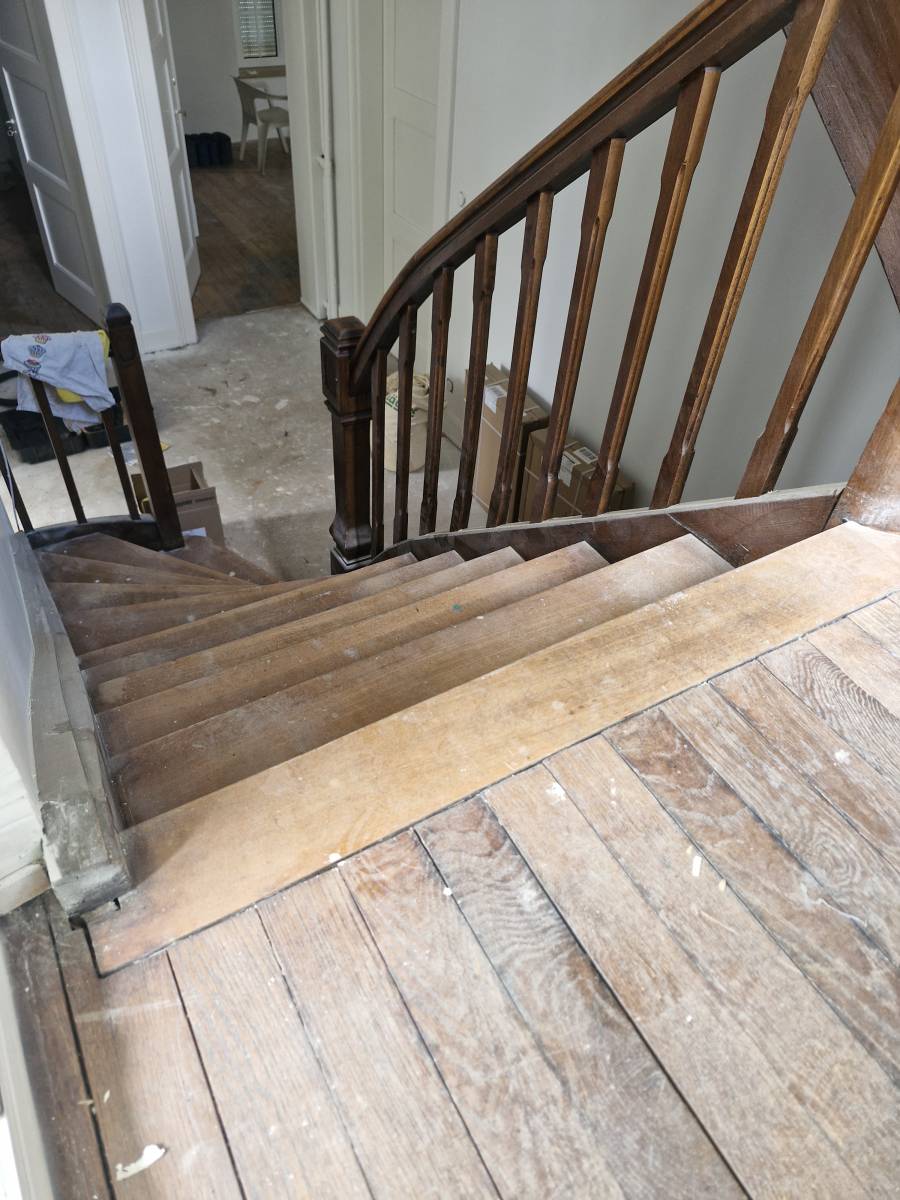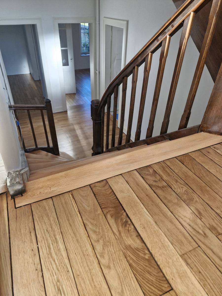Réalisation d'un ponçage sur un plancher ancien en chêne massif et d'une remise a jour de l'escalier dans le bas Rhin a Haguenau en face du parc belle vue.