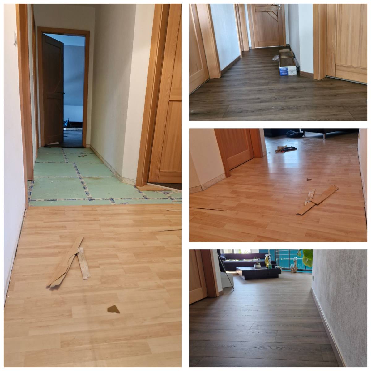 Dépose des plinthes et de l’ancien stratifié, remplacé par une sous-couche phonique et thermique, puis pose d’un stratifié Quick-Step de chez Dispano. Repose de plinthes MDF assorties au sol, en Alsace, à Bischwiller, dans le Bas-Rhin.