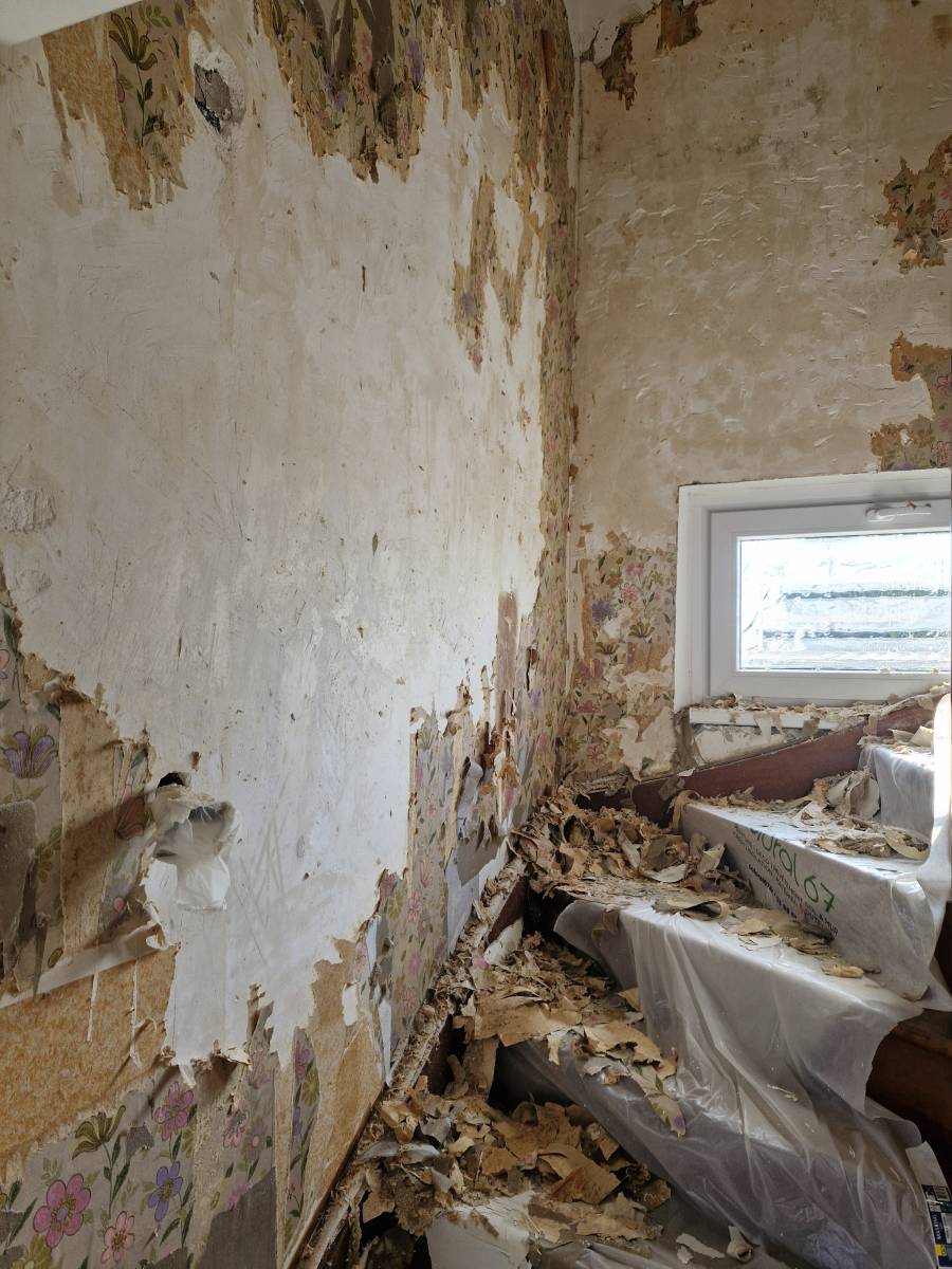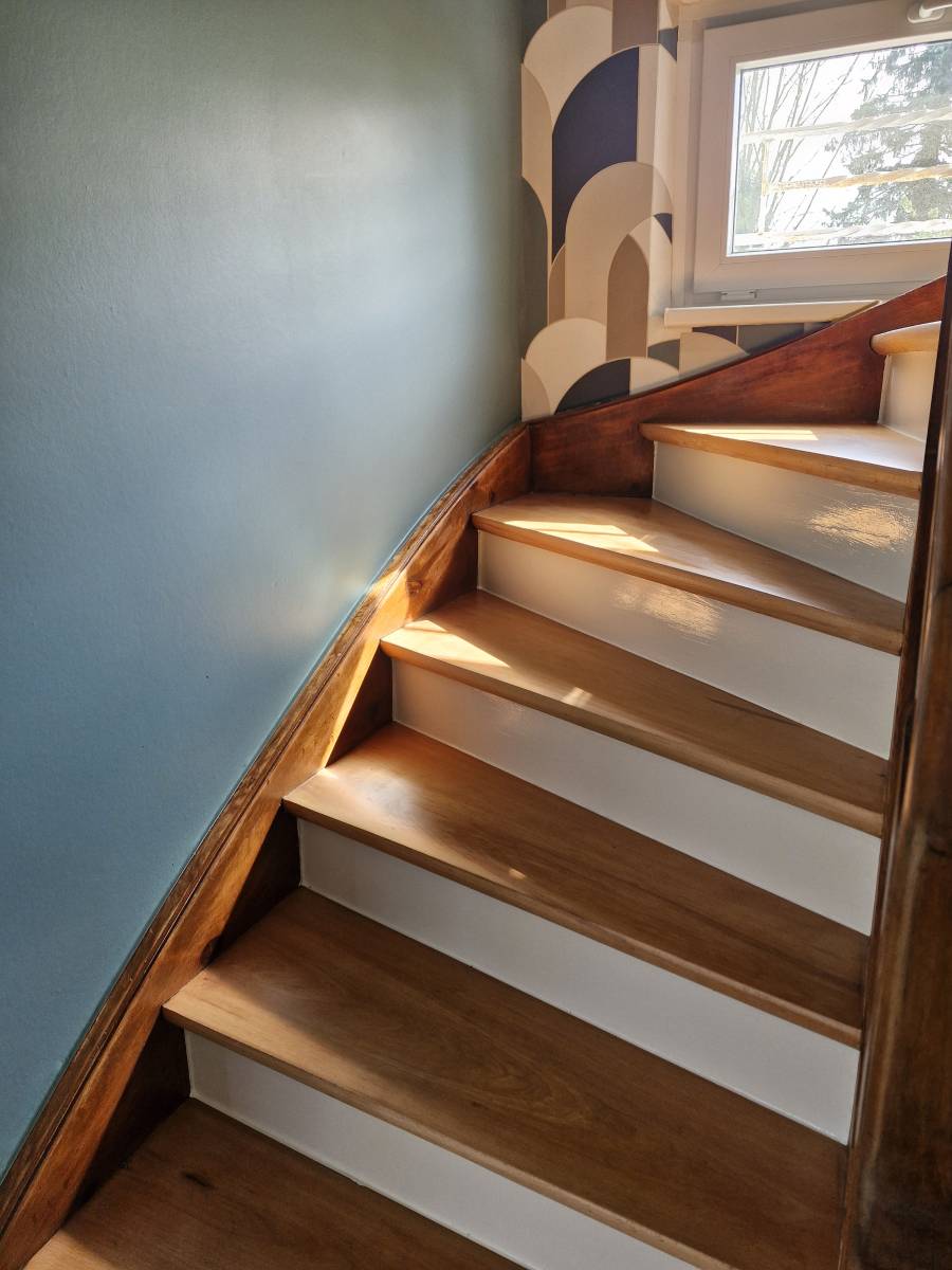dépose de l'ancien papier Peint, enduisage, ponçage des murs, pose de fibre lisse puis mise en peinture suivi d'un mur en papier Peint fini. les contre marches on était peint en blanc puis un ponçage des plat de marches et de nez de marche a était réaliser finition vitrificateur satiné