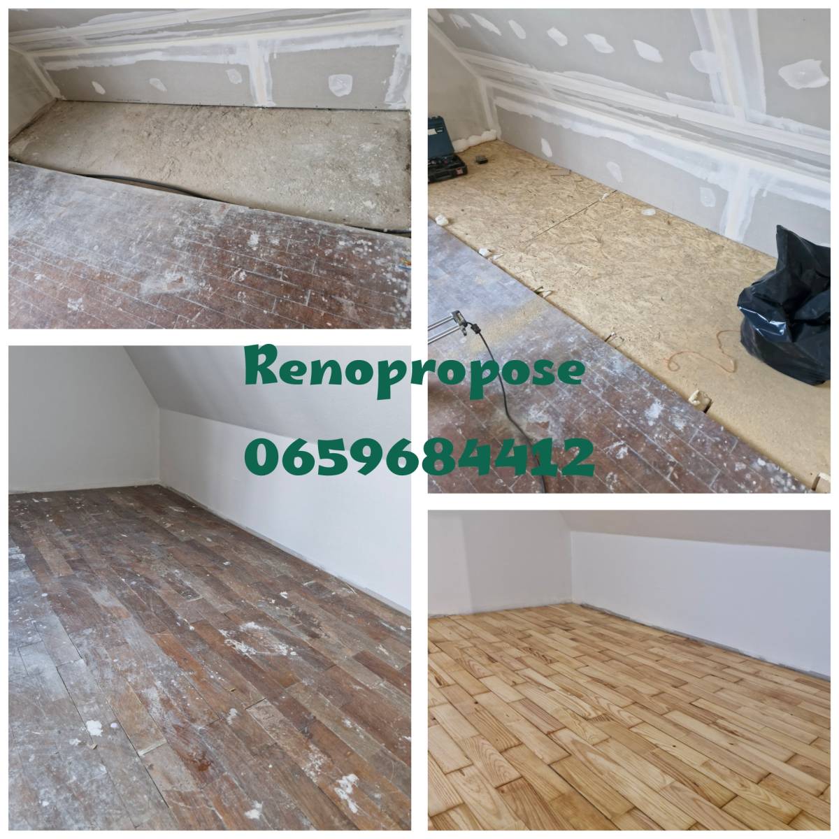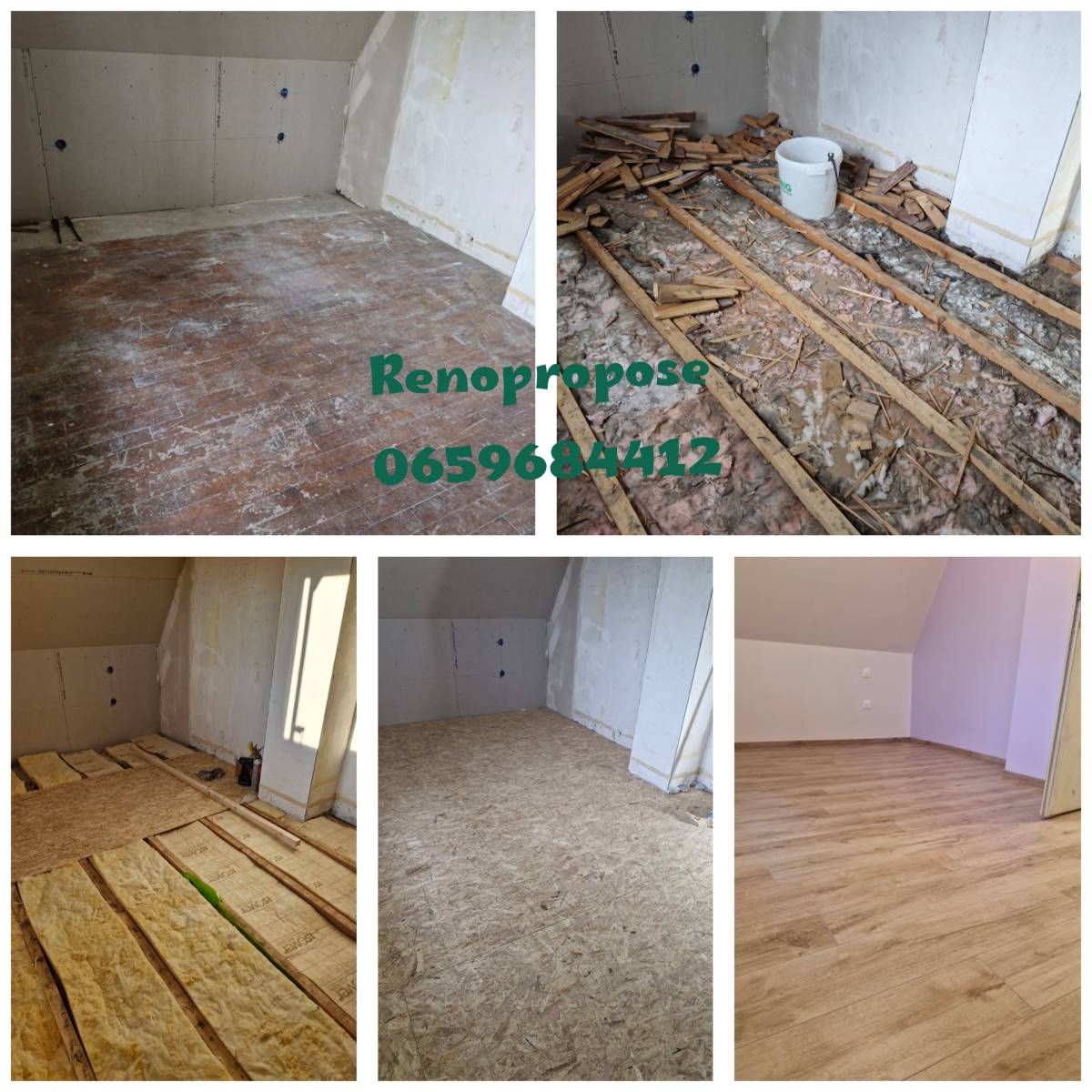 Pièce 1 dépose du plancher, complément de lambourde, pose de panneaux osb puis pose d'un stratifier avec les plinthes.