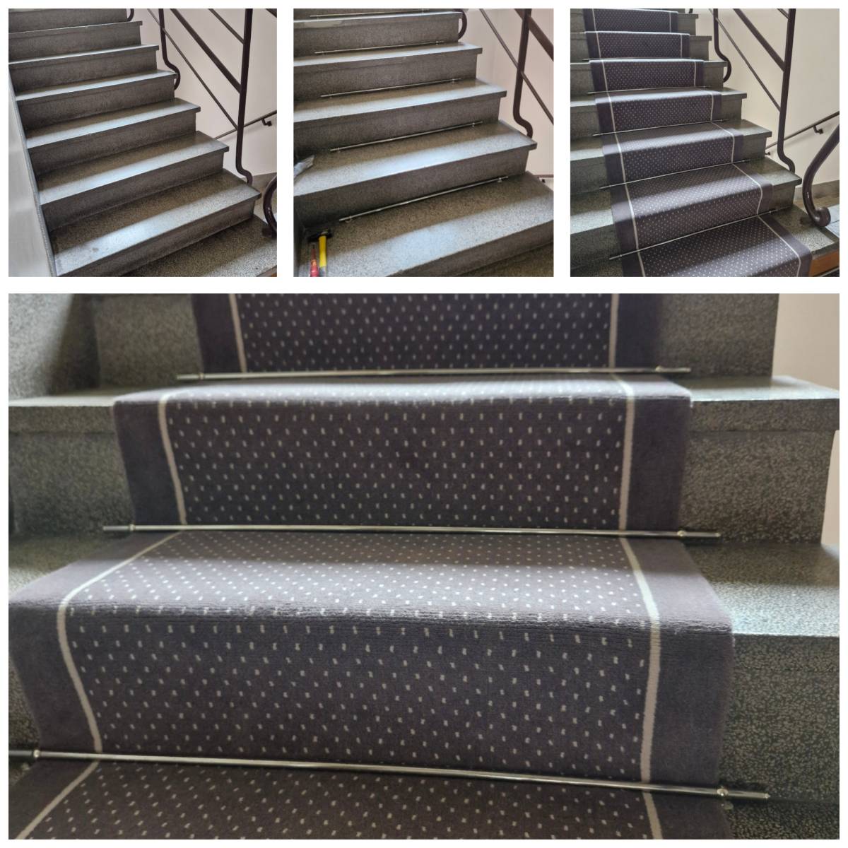 Vente et installation d’un tapis de passage Apollon de chez Louis de Poortere, sans surjet, largeur 70 cm. Pose d’une tringle de 80 cm et de pythons en inox en Alsace, à Strasbourg, dans le Bas-Rhin.